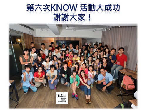 2013.08.10接棒啟蒙計劃KNOW活動來到了第六場,這次有從高雄、台中、宜蘭、桃園遠道而來參加活動的同學。對我們來說,這一次的活動具有特別的意義,因為在這塊土地上,有越來越多人願意相信自己可以成為"改變"的一部分,有越來越多學生相信自己的未來有不一樣的可能,所以我們齊聚一堂,把我們的理想和盼望接力往下傳承。接下來,我們會努力前往台中和高雄舉辦KNOW活動,希望大家可以繼續支持我們!
